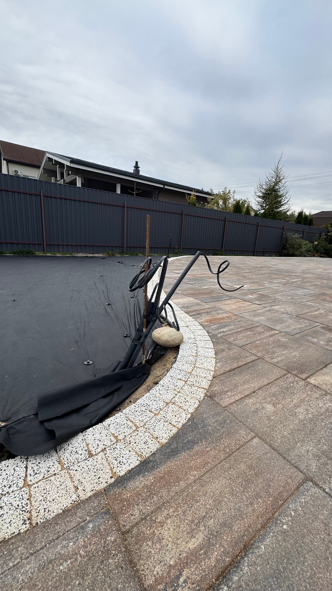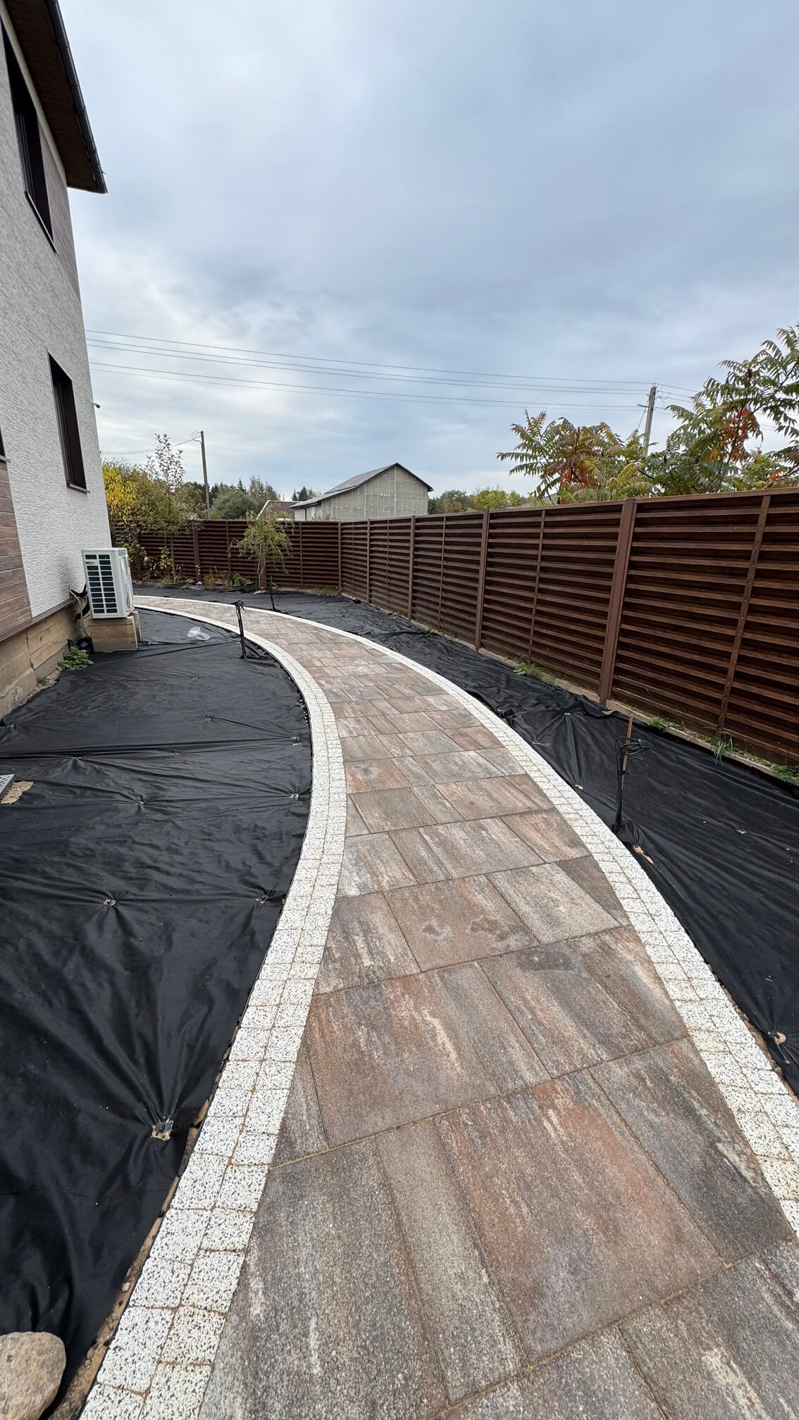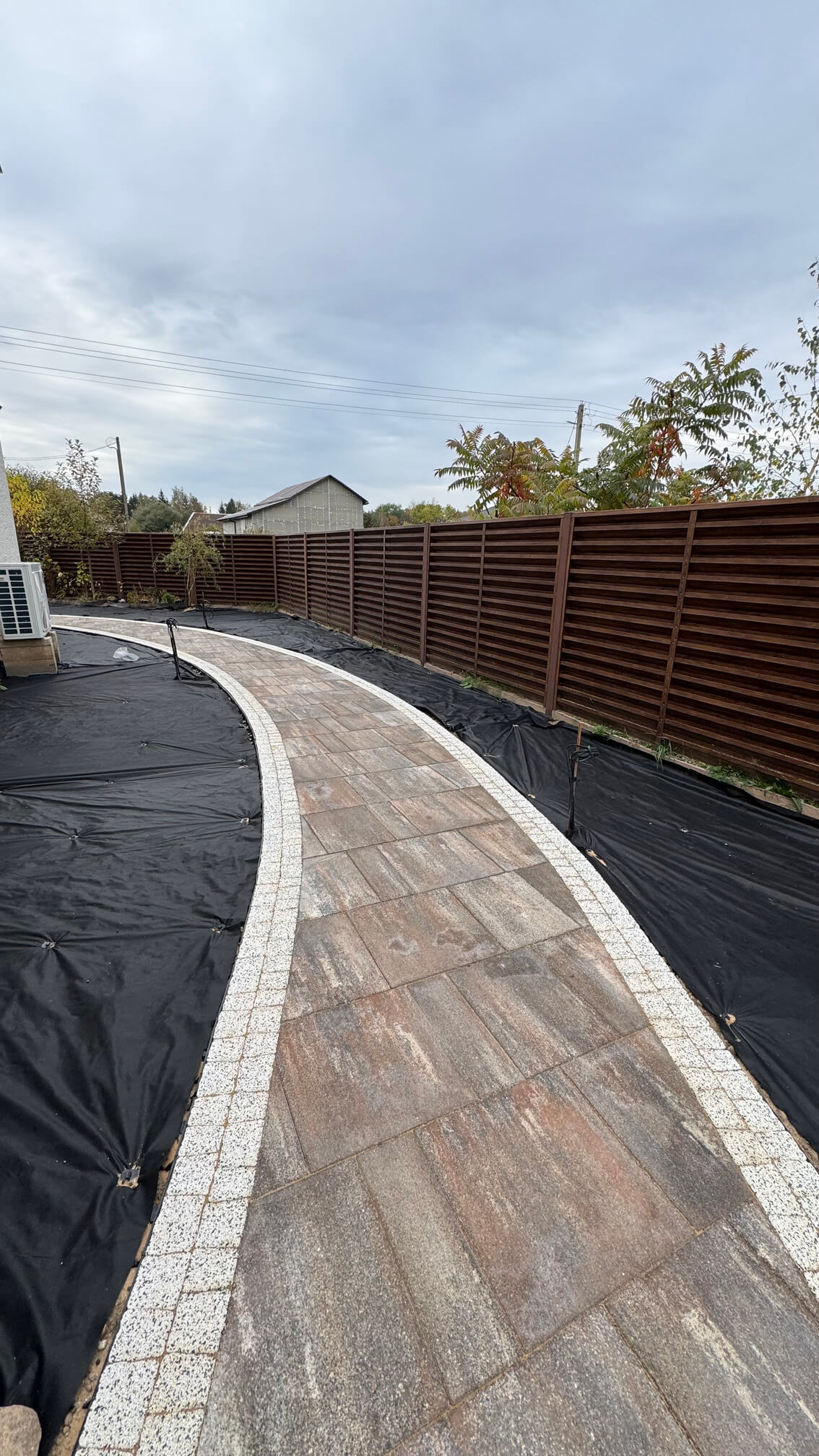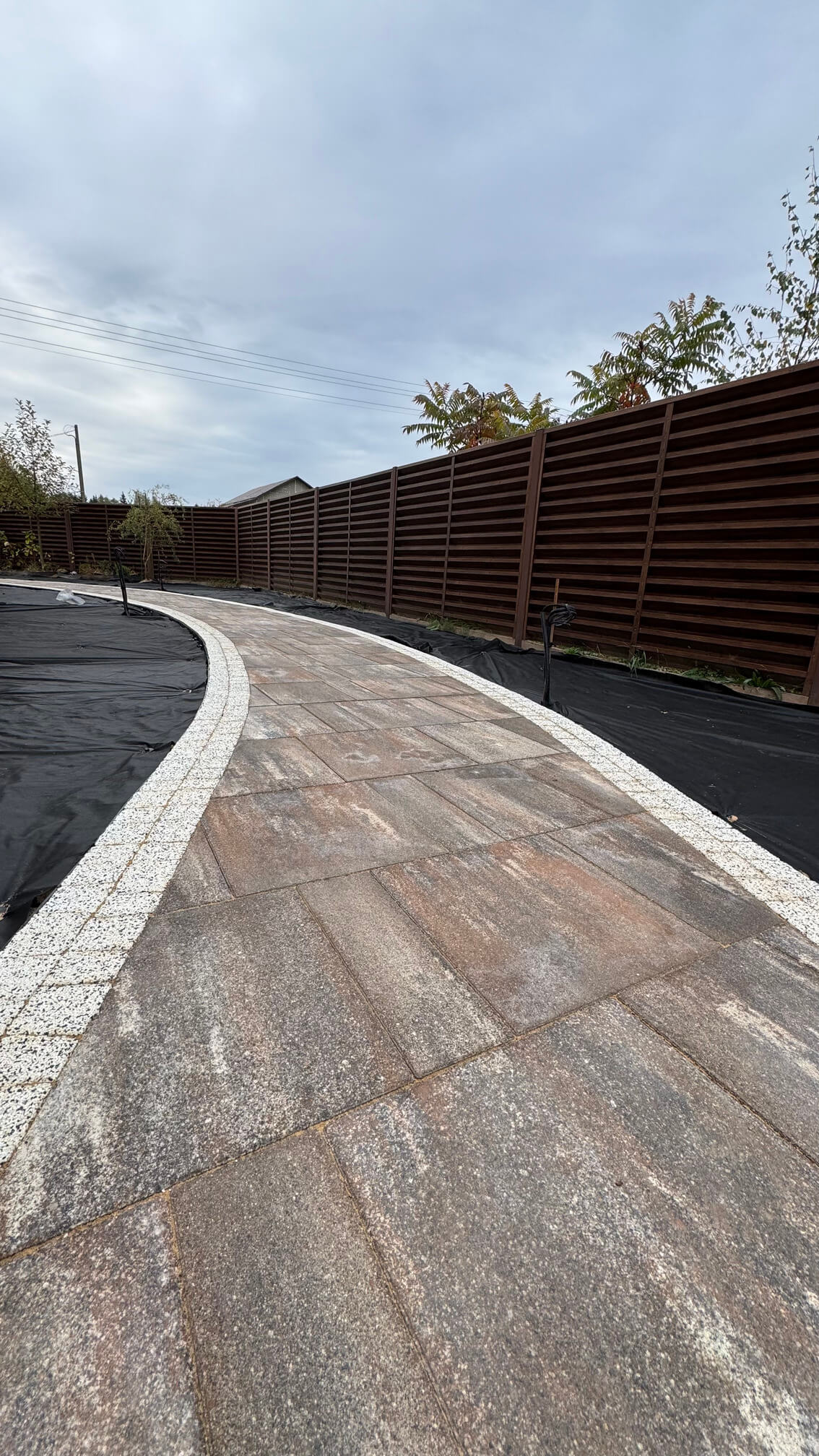 Завершением текущего этапа стала подготовка грунта под будущие посадки: выравнивание поверхности и укрытие геотекстилем для защиты от сорняков. В планах — продолжение мощения на оставшейся части участка, устройство газонов и автополива, посадка растений и монтаж светильников.
