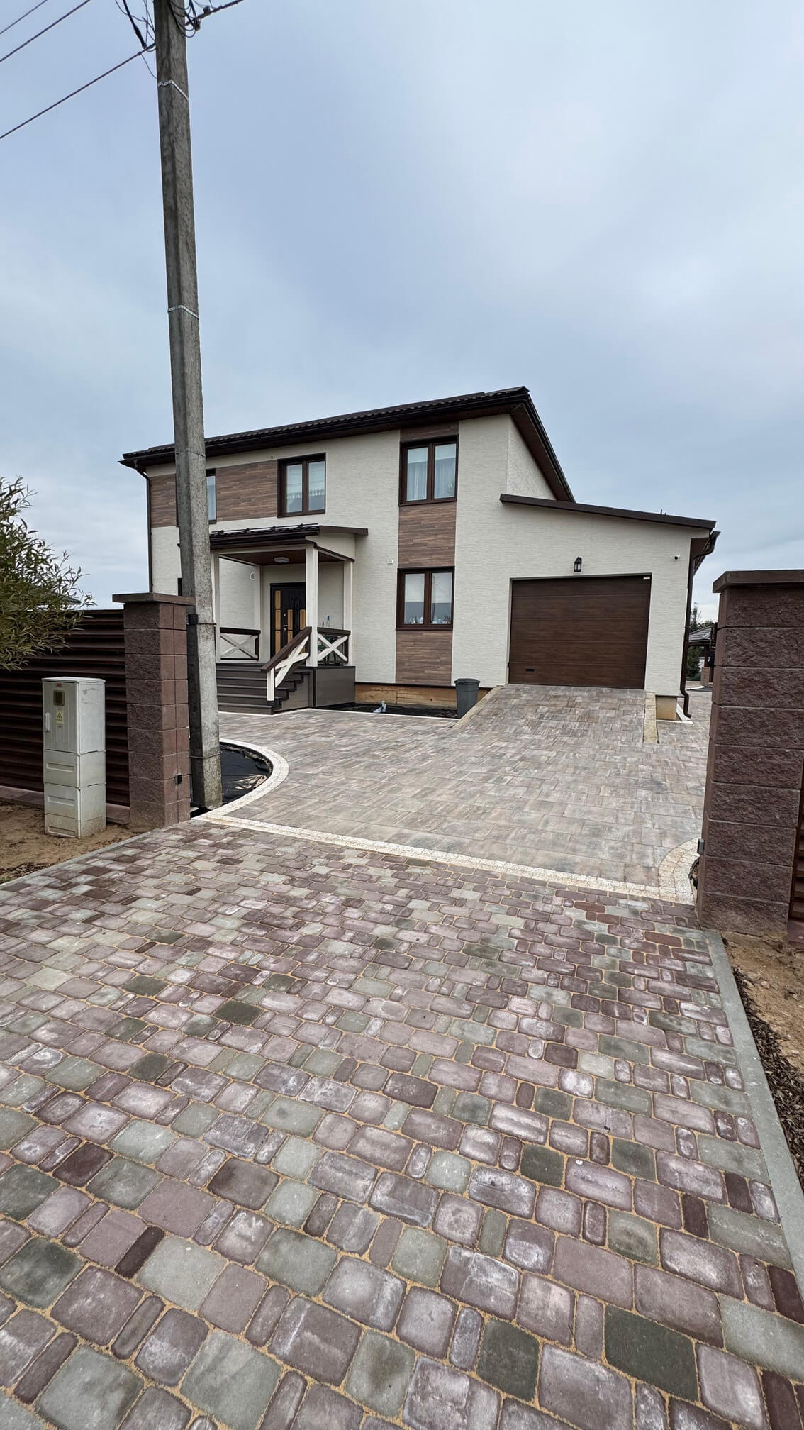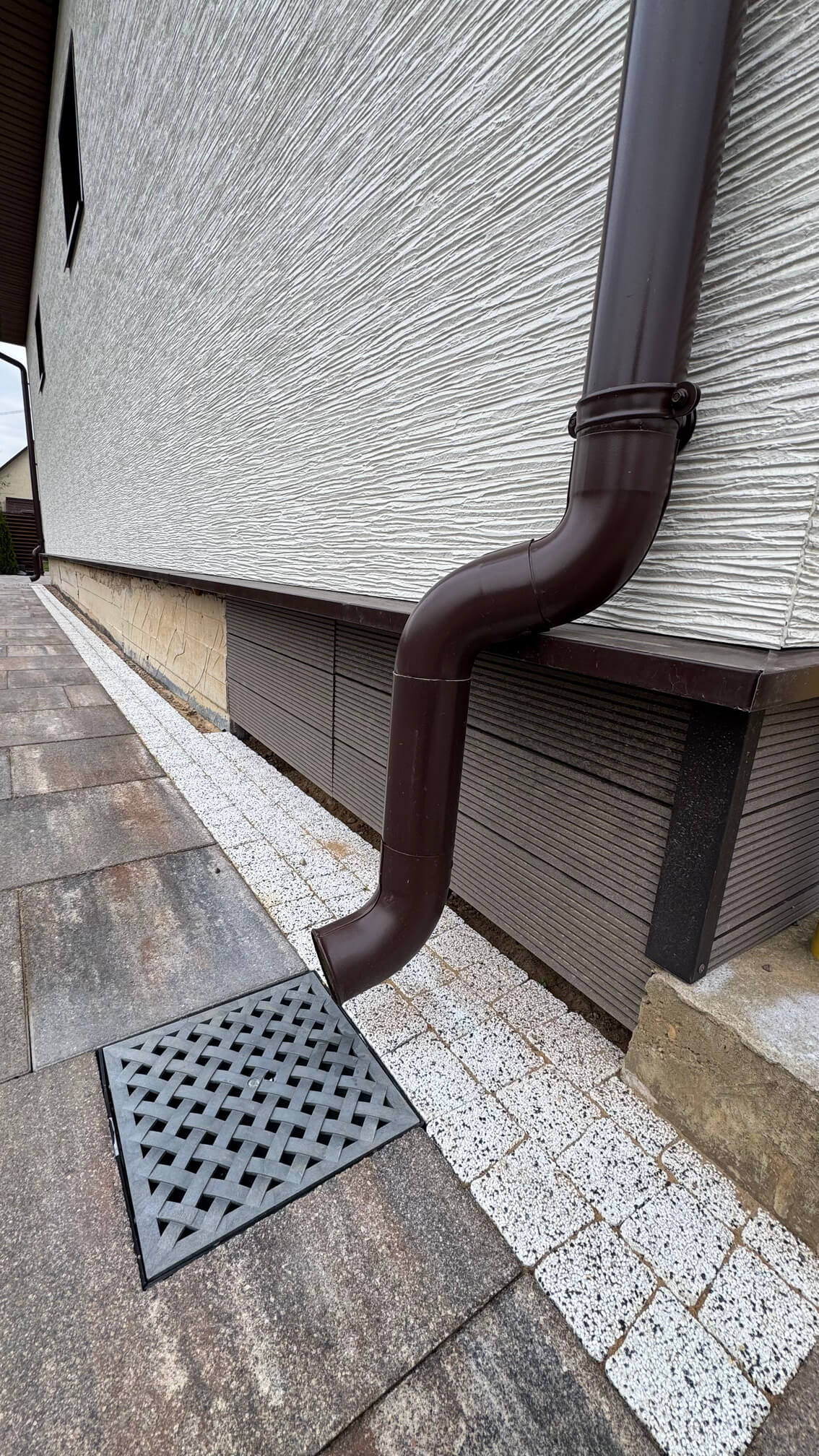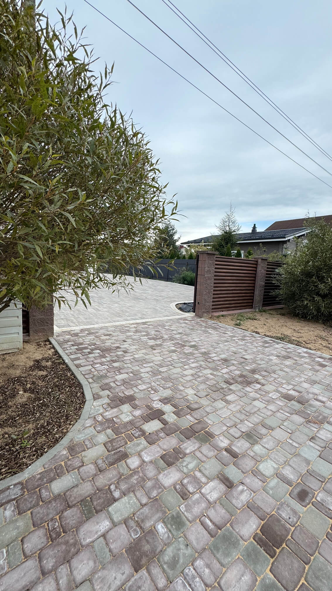 Сначала был создан индивидуальный проект, учитывающий существующие постройки и функциональные зоны. Далее смонтирована система ливневой канализации: установлены дождеприемники, проложены трубы и устроен ливневой колодец для эффективного отвода дождевых и талых вод.