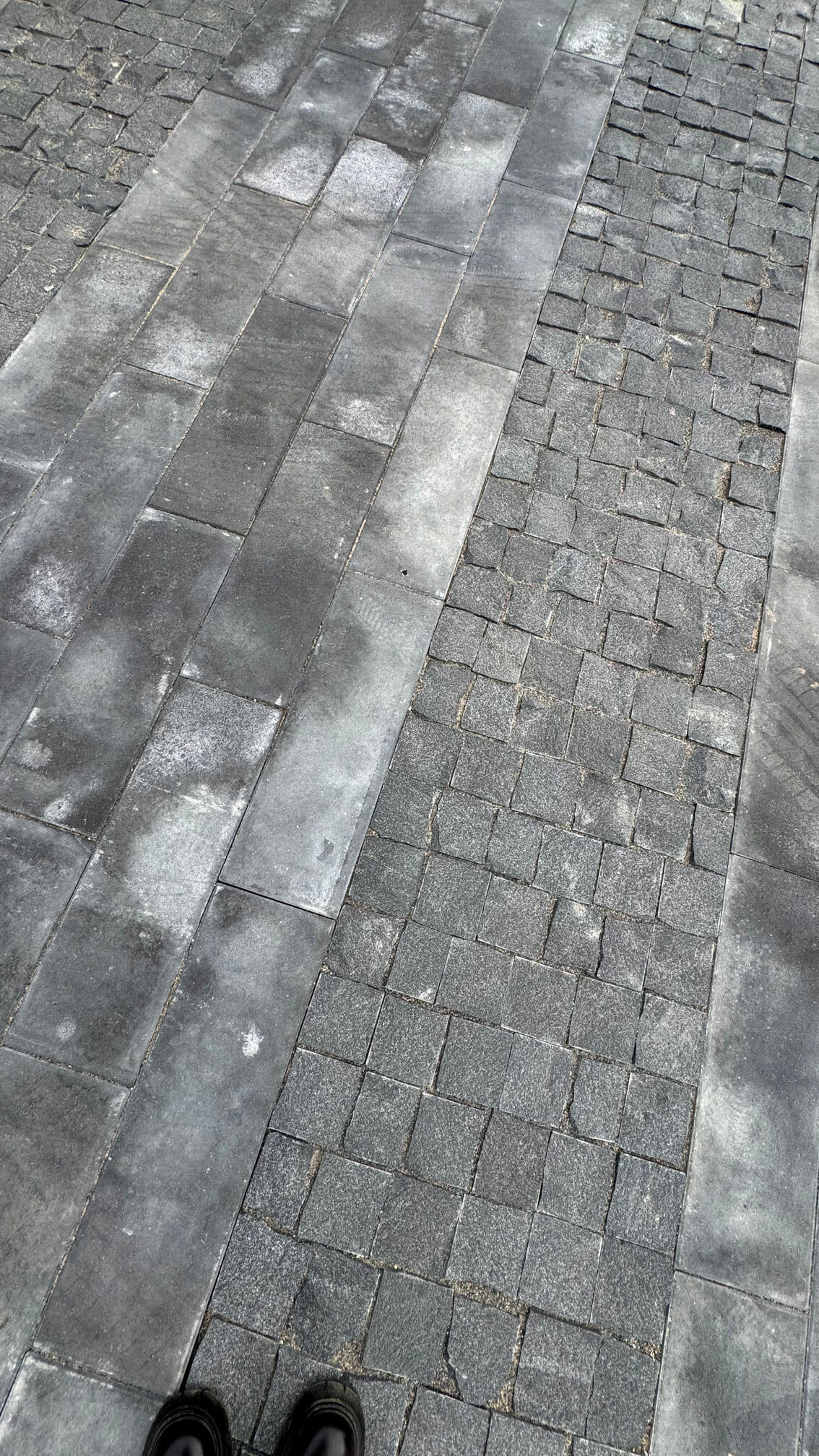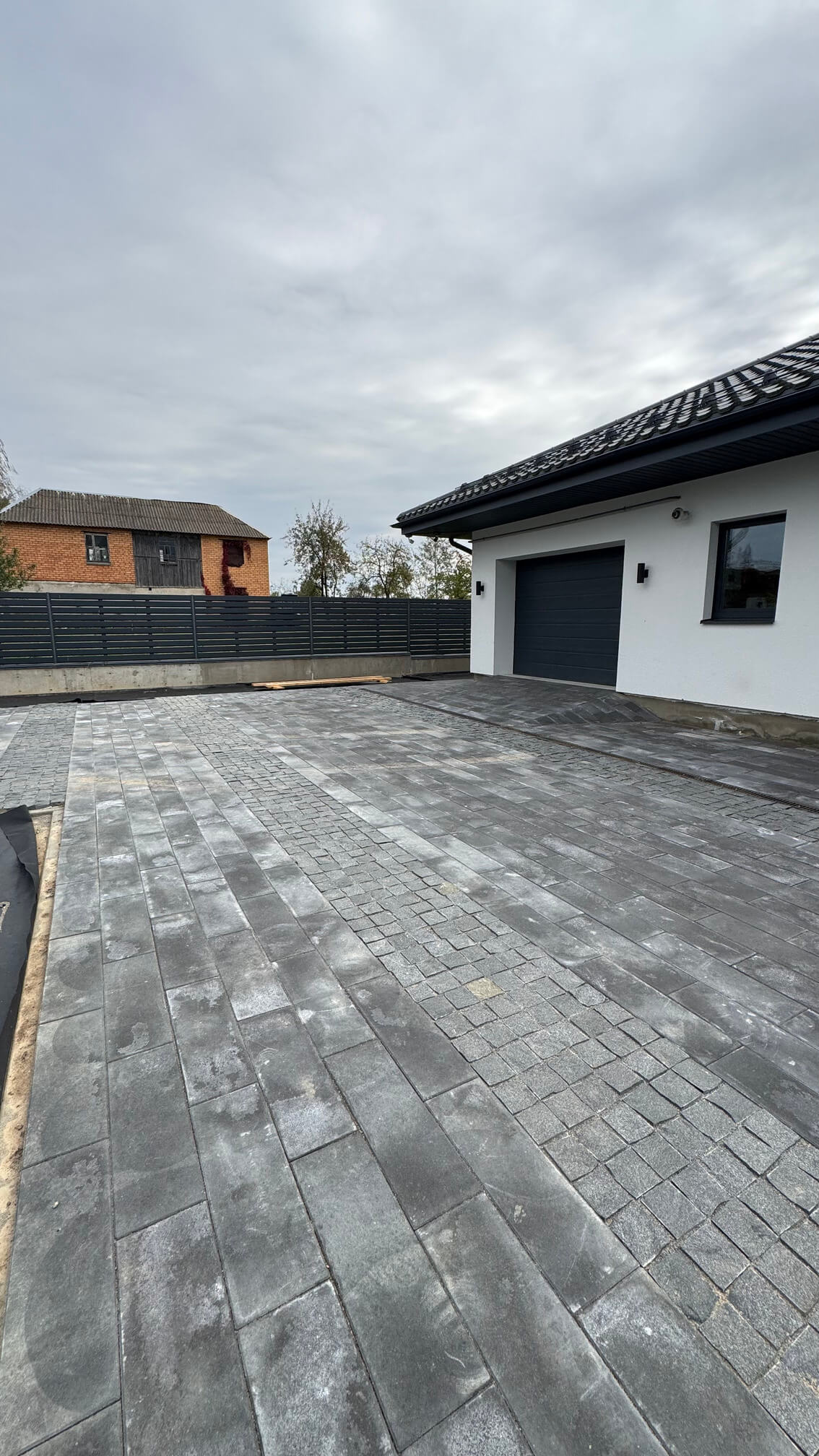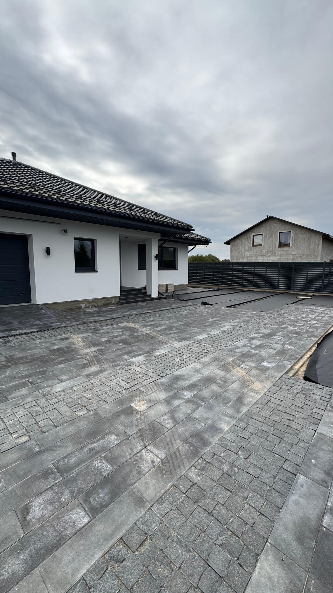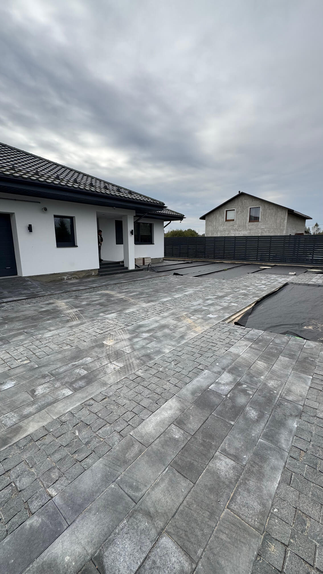 Первым этапом стал монтаж системы ливневой канализации: установлены дождеприемники и поверхностные лотки, проложены трубы для эффективного водоотвода. Далее выполнена комбинированная укладка широкоформатной плитки с гранитной брусчаткой, установлены пластиковые бордюры, а также устроены дорожки из щебня для удобного передвижения.